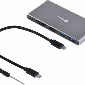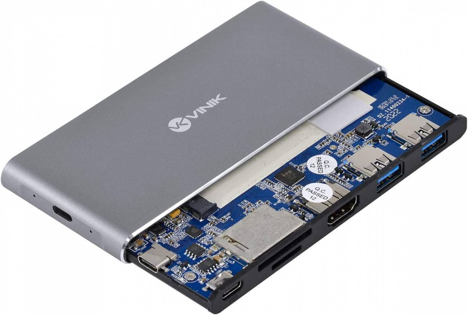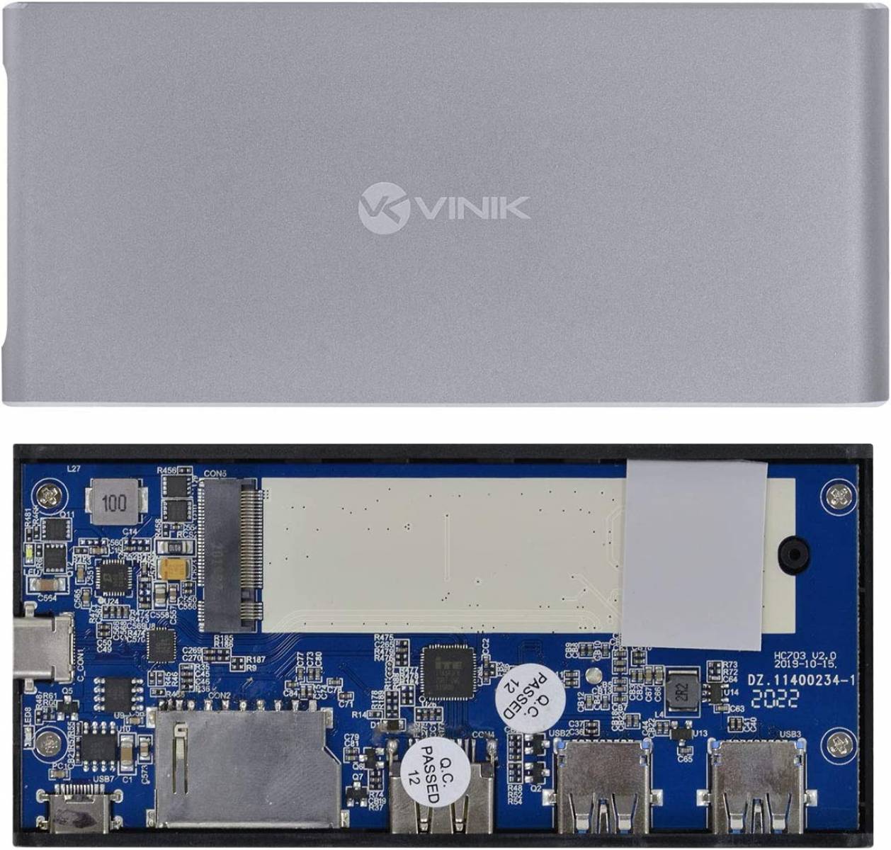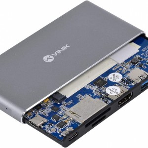 A Docking station DHC-6 da Vinik permite o uso de um SSD M.2 além das funções de HUB, ramificando para 2 portas USB 3.0, HDMI, leitor de cartão SD e TF e 1 porta USB tipo C com Power Delivery de 60W. O recurso Power Delivery permite o carregamento do dispositivo conectado mesmo com o HUB em uso.