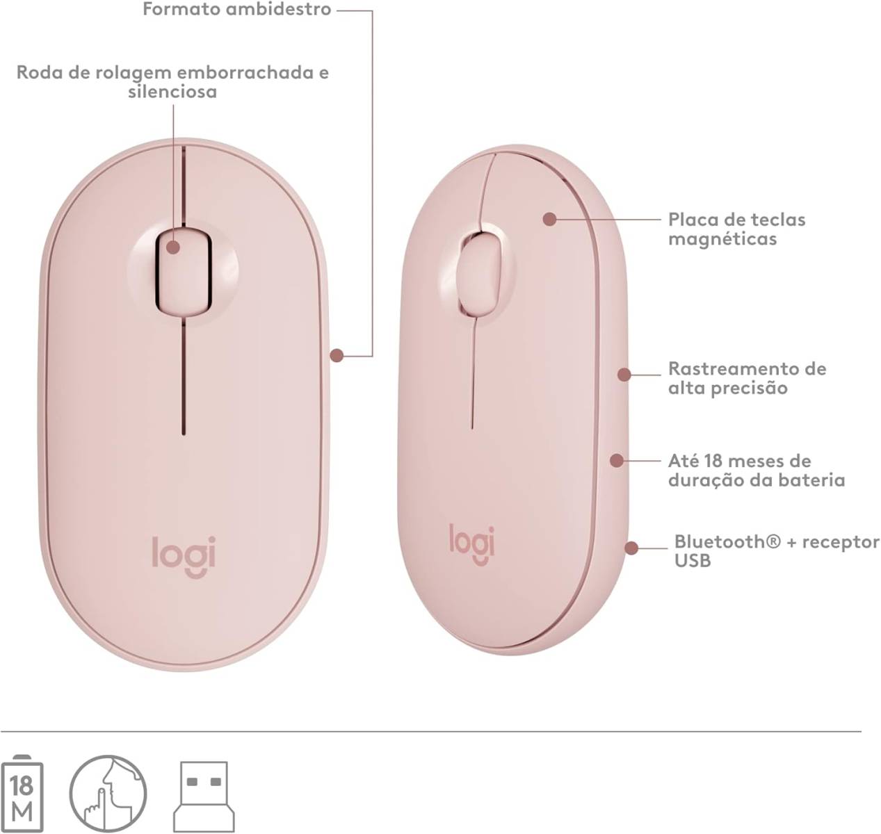 Mouse Tecnologia do sensor: Rastreamento óptico de alta precisão Resolução do sensor: 1.000 DPI Número de botões: 3 Roda de rolagem: Sim - Mecânico Botões de rolagem: Botão central Mouse habilitado para Unifying: Não Teclado habilitado para Unifying: Não Vida útil da pilha do mouse: 24 meses Tipo de pilha do mouse:: 1xAA